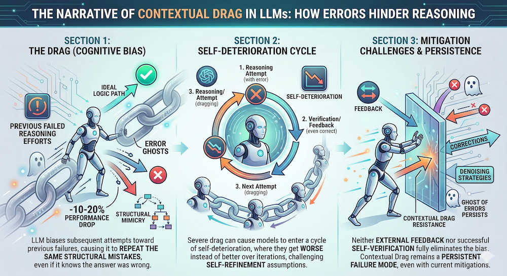 Connection to W11: This directly extends the "Verifier noise" failure mode from the Proposer/Solver/Verifier framework. Even when the Verifier correctly identifies errors, feeding those errors back as context can poison the Solver's subsequent attempts. The co-evolutionary approach from Agent0 (Section 2.1 above, NB 01) sidesteps this entirely by generating new tasks instead of retrying failed ones — making it inherently drag-resistant.